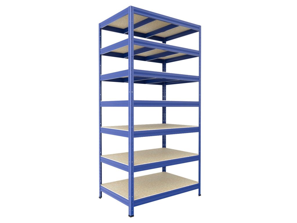 Bezskrutkový regál Biedrax 35 x 120 x 210 cm, modrý, 7 políc OSB 10 mm, nosnosť 200 kg na policu