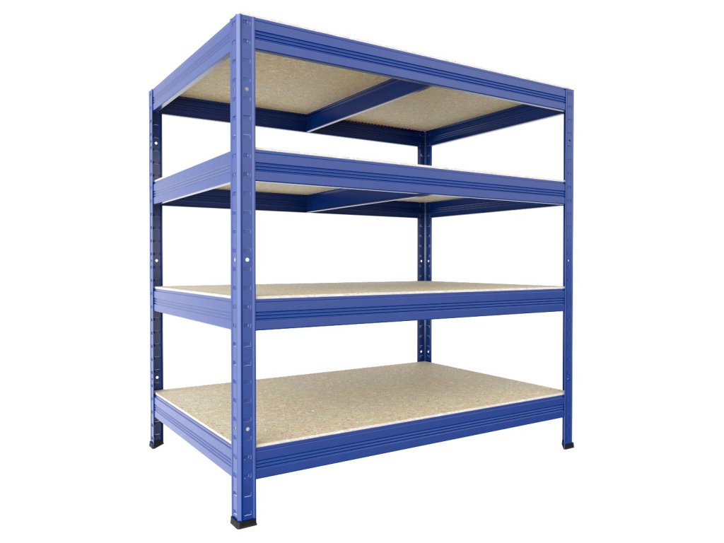 Bezskrutkový regál Biedrax 35 x 60 x 90 cm, modrý, 4 police OSB 10 mm, nosnosť 200 kg na policu