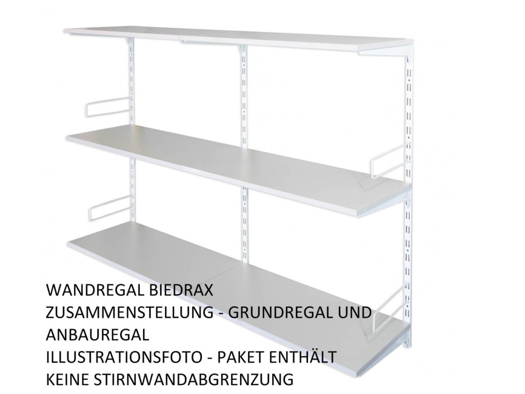 - Obsah balenia prídavný regál: 1 kovová nástenná lišta, kovové nosníky pod policu, polica drevotrieska lamino 18 mm, skrutky pre pripevnenie políc k nosníkom