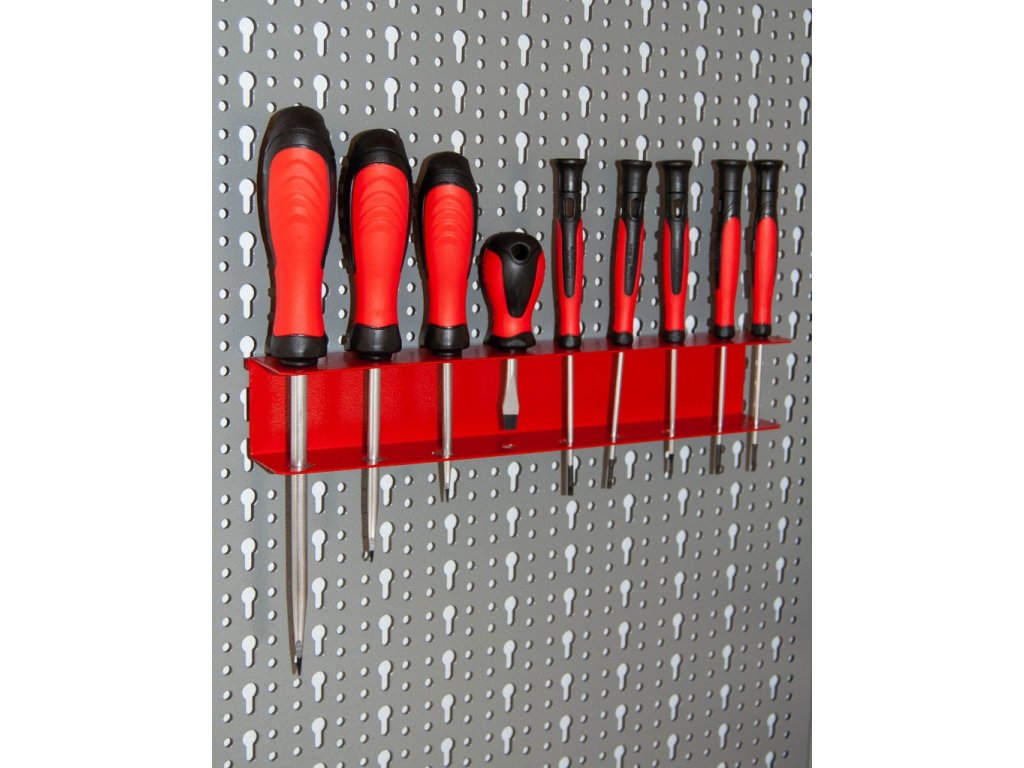 držiak 9 ks skrutkovačov na nástenný panel - NP5871 červený držiak skrutkovačov na nástenný panel - šikovný pomocník na uloženie skrutkovačov alebo podobného náradia v dielni, garáži- Dĺžka 30 cm