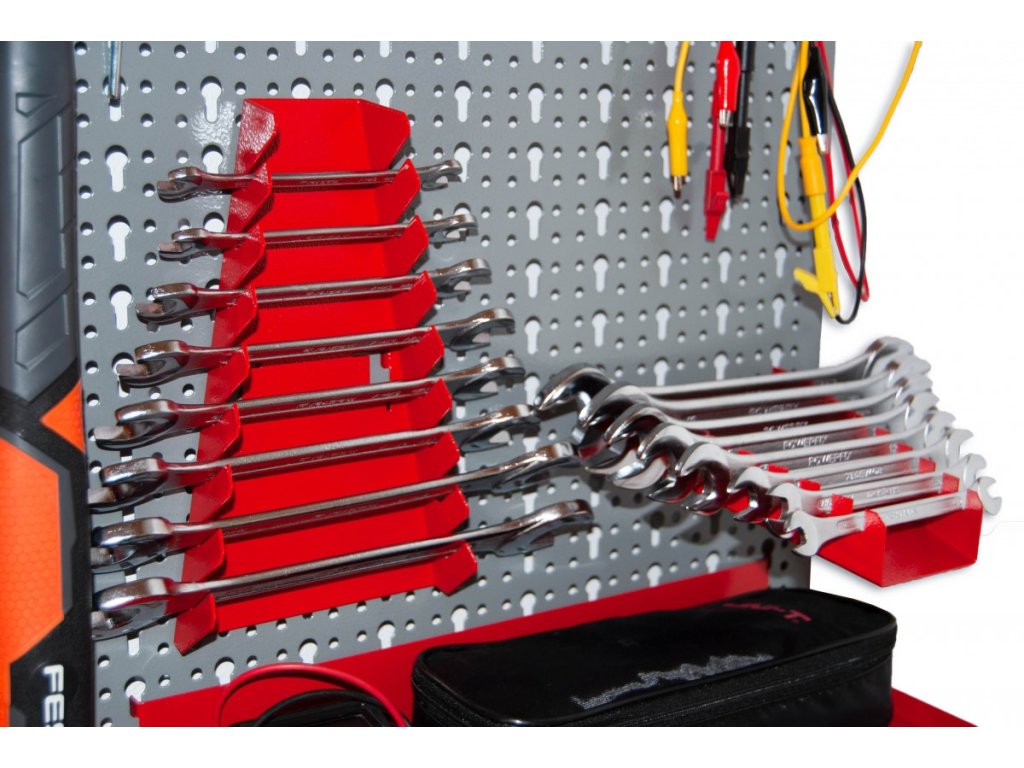 vodorovný držiak 8 ks kľúčov na nástenný panel - NP5850 lakovaný zvislý držiak kľúčov na nástenný panel, prehľadne uložíte bežné náradie a budete ho mať vždy po ruke vo vašu dielni či v garáži- Dĺžka 16,6 cm