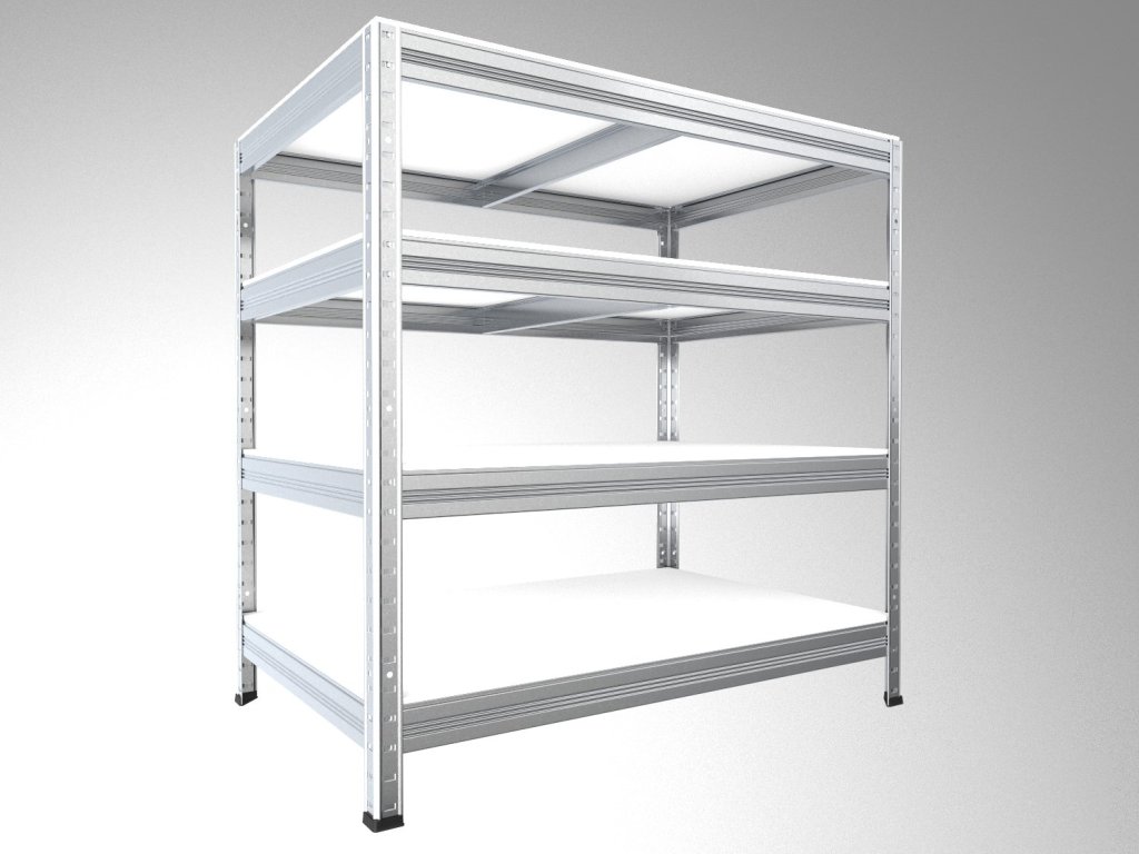 Kovové regály - kovová konštrukcia, police biela laminovaná drevotrieska 12 mm, ohranená ABS hranou zo všetkých strán. Police regálu preto sú odolnejšie proti vlhkosti. Údržbu regálov môžete robiť vlhkou handrou, ale nezabudnite na konci utrieť police do sucha . Regály sa jednoducho a rýchlo montujú, nosníky nasadíte do stojin a klepnutím dorazíte diely na doraz. Tento regálový systém je veľmi stabilný - žiadne skrutky! Regály sú vhodné do suchej pivnice, na pôdy, do skladov, do predajni, do dielne, do archívov