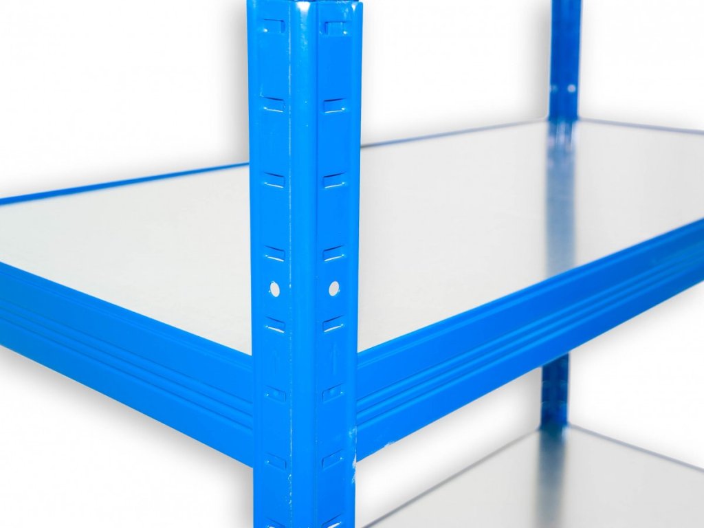 - PROSÍM POZOR - kovové stojky, nosníky a výstuhy sú lakované vypalovacou práškovou farbou modrá RAL5010. Ale police sú vyrobené z pozinkovaného plechu 0,8 mm, nie sú lakované práškovou farbou, jedná sa o pozinkovaný strieborný plech