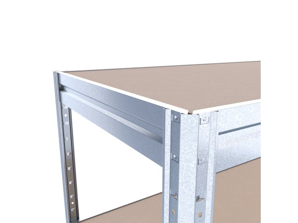 Veľký policový regál s policami z MDF dosiek, ktoré sú vyrábané pod vysokým tlakom bez použitia lepidiel. Tento ekologický materiál zaisťuje vysokú odolnosť a stabilitu. Unikátny bezskrutkový systém montáže umožňuje rýchle zostavenie – nosníky stačí zasunúť do stojín a zaistiť ľahkým poklepaním. Pevné spojenie bez skrutiek zaručuje tuhosť celej konštrukcie. Upozornenie: MDF police sú vhodné iba do suchých priestorov. Stabilný a priestranný veľký regál je vhodný pre objemnejšie a vysoké záťaže. Výstuhy pod každou policou účinne bránia ich prehýbaniu.