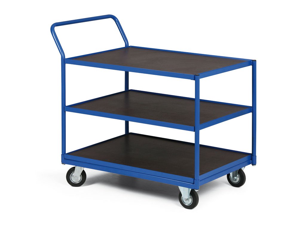 Konštrukcia vozíka je zvarená z oceľových profilov. Nosnosť vozíka je 400 kg. Lakované práškovým vypaľovacím lakom v odtieni RAL5005 - modrá. Polica z vodovzdornej preglejky, vysoká nosnosť a odolnosť. Rozmer police 1000 x 700 mm. Kolesá na vozíku sú od francúzské firmy Guitel, čím je zaručené malé opotrebenie a nosnosť aj pri ťažkých prevádzkových podmienkach. Kolesá sú vybavené krytom, ktorý bráni namotávaniu nití a špagátov a taktiež zanášaniu ložiska rôznymi nečistotami. Kolesá sú plná a majú tichý chod. Kolesá majú priemer 200 mm a 2 sú pevné a 2 otočné podľa vlastnej osy. Kolesá možno na objednávku doplniť dvojčinnou brzdou proti pohybu a proti otáčaniu okolo zvislej osi.