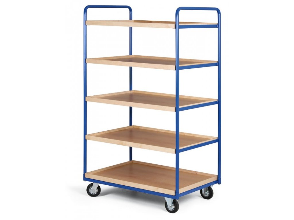 dielenský policový vozík vhodný na prepravu rôzneho druhu tovaru či drobnejšieho materiálu do skladov, výrobných hál a prevádzok. Konštrukcia vozíka zvarená z oceľových profilov. Lakované práškovým vypaľovacím lakom v odtieni RAL5005 - modrá. Police z drevotriesky. Kolesá vybavené krytom, ktorý bráni namotávaniu nití a špagátov a taktiež zanášaniu ložiska rôznymi nečistotami. Kolesá možno na objednávku doplniť dvojčinnou brzdou proti pohybu a proti otáčaniu okolo zvislej osi.