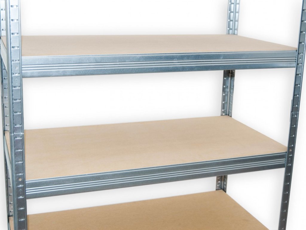 Kovové regály - kovová konštrukcia, police zo stredne husté drevovláknité dosky - skrátene MDF, tieto dosky patria k prírodným materiálom. MDF - drevovláknité dosky sa lisujú pod vysokým tlakom a sú na rozdiel od drevotrieskových políc pevnejšie. Ale pozor - police MDF nie sú vhodné do vlhkých priestor. Regály sa veľmi jednoducho skládajú - regálové nosníky zasuniete do stojin a poklepom gumovym kladivkom dorazíte diely na doraz. Tento regálový systém zaručuje vysokú stabilitu regálov, ale aj rýchlosť montáže regálov - žiadne skrutky! Regály sú vhodné do suchej pivnice, na pôdy, do skladov, do predajni, do dielne, do archívov