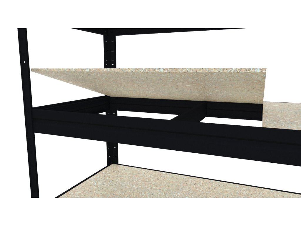 Veľký regál do domácnosti s kovovou konštrukciou a policami z drevotriesky JSD 10 mm. Regály s drevotrieskovými policami JSD sú vhodné aj do vlhkých priestorov. Vlhkým priestorom sú myslené prístrešky, pergoly, pivnice a pod. Regály s policami JSD nie sú určené do exteriéru s priamym pôsobením zrážok. Rýchla montáž behom pár minút, nosníky sa zasunú do stojinek a klepnutím sa dorazí diely do kónusu. Stabilný a priestranný Veľký regál do domácnosti s nosnosťou 400 kg na policu je vhodný pre objemnejšie a ľahšie záťaže, výstuhy pod každou policou proti prehýbaniu políc