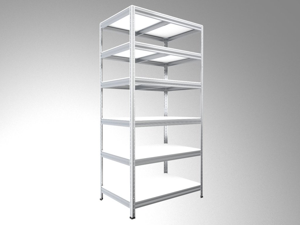 Regál do skladu s policami z bielej laminovanej drevotriesky (hrúbka 12 mm), ktoré sú ohranené ABS hranou zo všetkých strán. Vďaka tomu sú police odolnejšie voči vlhkosti a ľahko sa udržiavajú – stačí ich utrieť vlhkou handrou a dosucha vytrieť. Montáž je rýchla a jednoduchá vďaka bezskrutkovému systému, ktorý zaručuje vysokú stabilitu.