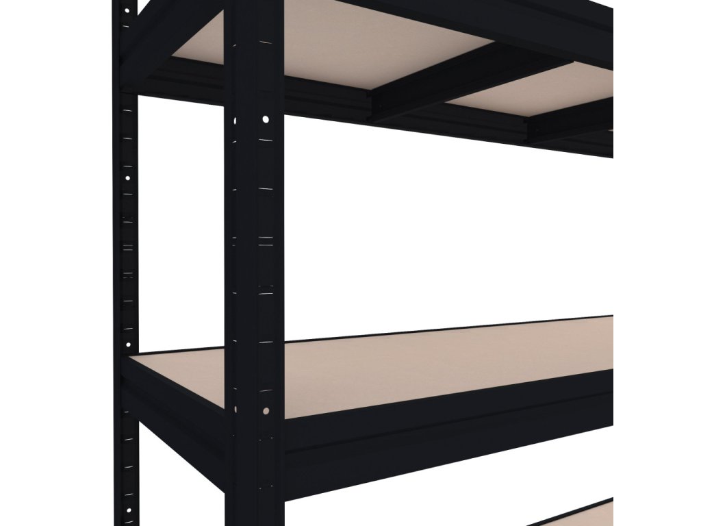 Veľký regál do skladu s policami z MDF dosiek, ktoré sú vyrábané pod vysokým tlakom bez použitia lepidiel. Tento ekologický materiál zaisťuje vysokú odolnosť a stabilitu. Unikátny bezskrutkový systém montáže umožňuje rýchle zostavenie – nosníky stačí zasunúť do stojín a zaistiť ľahkým poklepaním. Pevné spojenie bez skrutiek zaručuje tuhosť celej konštrukcie. Upozornenie: MDF police sú vhodné iba do suchých priestorov. Stabilný a priestranný veľký regál je vhodný pre objemnejšie a vysoké záťaže. Výstuhy pod každou policou účinne bránia ich prehýbaniu.